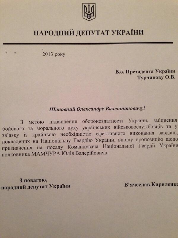 Мамчура предлагают сделать главой Нацгвардии (ДОКУМЕНТ)