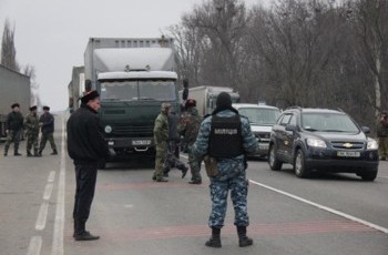 На під`їзді до російського блокпосту стає видно, що він вщент перегороджений бетонними блоками, і що через нього йшло багато військової техніки – асфальт прогнувся і просів. Над бетонними барикадами тріпотять російські триколори. В полі обабіч дороги – вкопані в землю БТРи, а далеко в полі видніється колона військових тентованих вантажівок для перевезення солдатів.