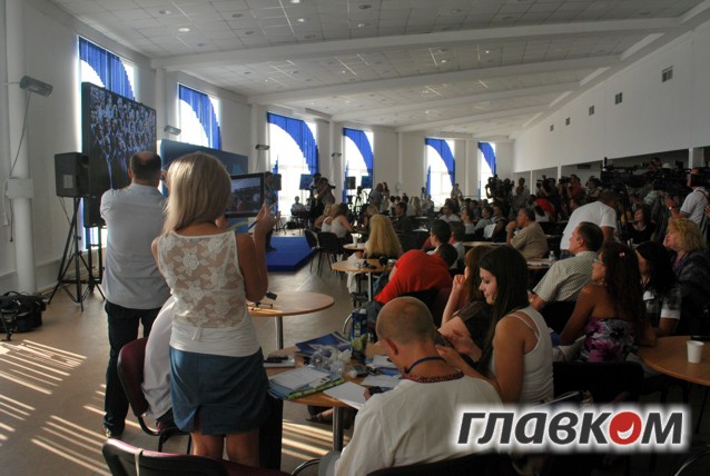 Планировалось, что съезд откроется в половину шестого, но все началось с часовым опозданием. Виктор Федорович как раз летал в Енакиево и чуть-чуть придержался. А пока его ждали и журналистам, и делегатам томный диктор зачитывал тексты о том, как пресловутое «покращення» шагает по стране.