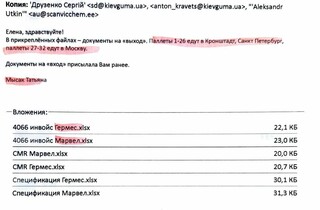 Як зазначають джерела, фірма в Естонії, якій постачали товари тактичної медицини, була лише прокладкою. Зокрема, директор відділу логістики «Київгуми» Тетяна Мисак спілкується безпосередньо з представником російської ТОВ «МКТ». Вона повідомляє естонським менеджерам про те, що товар поставляють у Кронштадт, Санкт-Петербург та Москву.