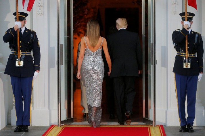 Американський президент і його дружина влаштували традиційну вечерю на честь гостей, запросивши їх в свою офіційну резиденцію. Господиня прийому, 47-річна Меланія Трамп, зустрічала їх в сріблястій блискучій сукні, і такого ж відтінку туфлях на підборах.