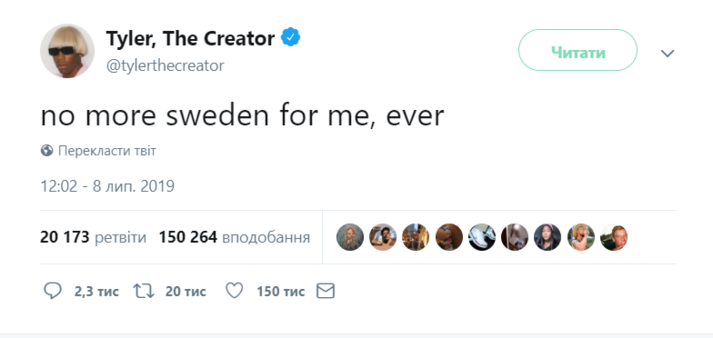«Больше никакой Швеции для меня, никогда», – написал Tyler, The Creator.