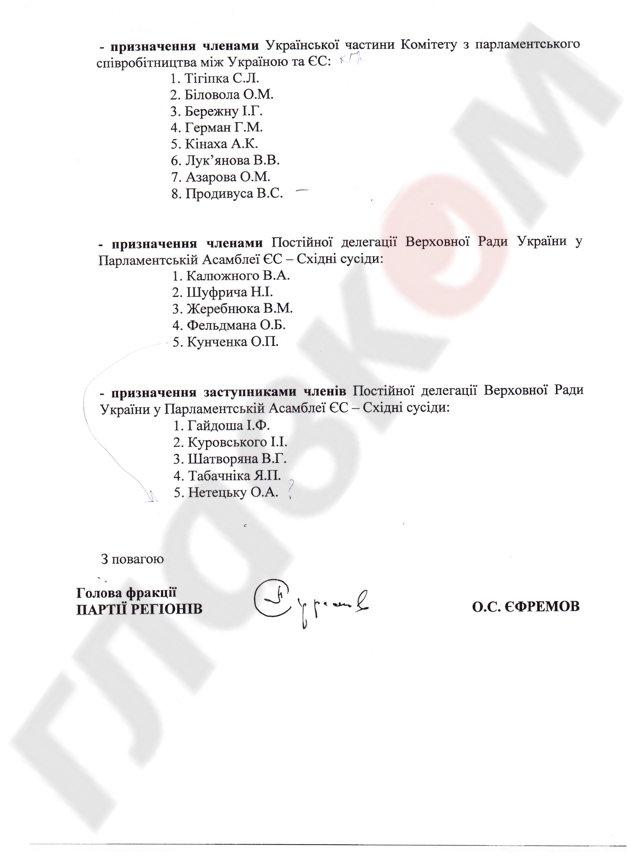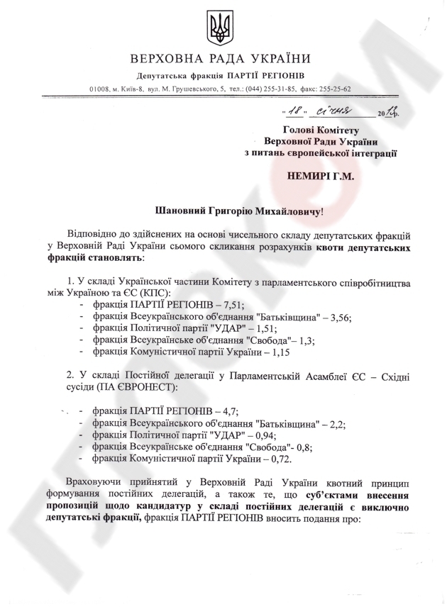 Комитет без проблем утвердил квоты всех парламентских политических сил в обеих постоянных делегациях. Итак, 16 человек от Украины в Комитете по парламентскому сотрудничеству с ЕС поделили следующим образом: Партия регионов – 7 человек, «Батькивщина» - 4 человека, «Удар» - 2 человека, «Свобода» и коммунисты по одному. Еще одно место отдали для квоты нефракционных. Расчет проводился исходя из численности фракций, а также количества нефракционных депутатов.