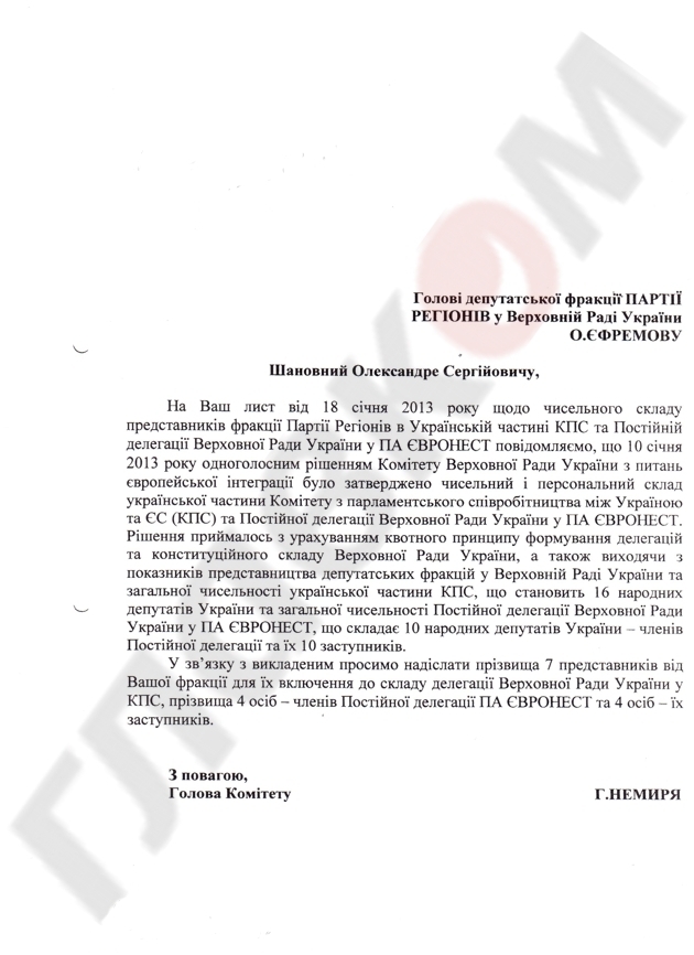В своем письме на имя главы комитета Григория Немыри от 18 января 2013 года Александр Сергеевич выразил несогласие с предложенной формулой раздела мест в делегации. Теоретически, формула выглядит так: общее количество депутатов делится на количество членов делегации; полученное число – это вес каждого члена делегации в расчете на число депутатов; далее количество членов фракций делится на этот вес. Вот и получается дробное число членов делегации. У кого больший остаток после запятой, тот и получает бонусы. Все, как при распределении мест в парламенте по результатам партийных списков.