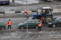 На фото ви бачите людей в помаранчевих жилетках і машини.