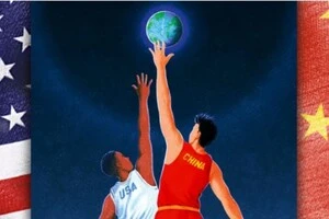 На малюнку зображено двох баскетболістів у формі команд США та Китаю. Вони тягнуться за планетою Земля, що символізує м'яч