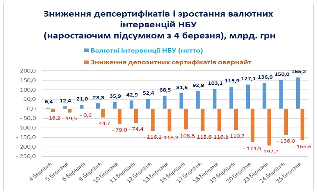 Куди йдуть кошти? Звісно – на валютний ринок. За останні 16 банківських днів НБУ продав валюти на точно таку ж суму (на 165,2 млрд. грн). (Див. графік!). 25.03.2026 року продано 350 млн. дол. Не впевнений, що в НБУ розуміють , що відбувається. Вони носилися з своєю валютною лібералізацією, як з писаною торбою. А тепер бояться признатися, що ця валютна лібералізація фактично розриває валютний ринок, а валютний попит зростає по спіралі. Валютні резерви міліють досить швидко. Вся гривнева ліквідність максимально виводиться у валюту. Залишаються строкові 3-місячні депсертифікати вкладені під 18,5% річних за рахунок строкових депозитів вкладників. Але думаю, що настане і їх черга. І ніякі ставки цей процес не зупинять. Оскільки структурний валютний дефіцит у нас 40 млрд. дол. на рік. І тому гратися у валютну лібералізацію в таких умовах - це те ж саме що гратися з вогнем.. Тепер доведеться розплачуватися надмірними витратами з валютних резервів.