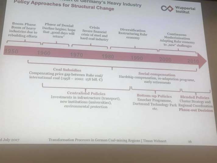- Реформа вугільної галузі розглядається так – “в які нові сектори економіки треба вкласти гроші, щоб створити нові можливості у регіонах видобутку?”. Не як допомогти саме шахтарям, а от саме як створити нові точки росту економіки саме для вказаного регіону. Наприклад, у регіоні Рур, Дюсельдорф було створено 20 університетів із 1960-го року. Нині 40% від коштів допомоги ЄС направляється на “інновації і дослідження”. Як не намагалася знайти інформацію про якісь унікальні соціальні пакети для шахтарів, почула лише про можливість раннього виходу на пенсію. Були певні програми перенавчання, але зважаючи на те, що всі шахти приватні, то ринок регулював більшість питань соціальної адаптації. Загальний принцип дуже відмінний від того, що я чую у нас – вугільна галузь неприбуткова (якщо включити у вартість для суспільства всі негативні наслідки), а тому немає сенсу в неї вкладати жодну копійку.