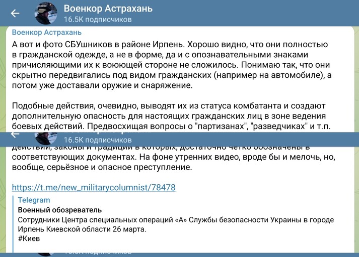 Так создаются фейки. Кремлевские телеграм-каналы сначала пишут, что есть фото сотрудников Альфы СБУ от 26 марта. Затем в следующем посте добавлять, что это масскировка. И уже в третьем посте и в публикациях СМИ пишут, что Альфа прикрывалась гражданскими в гуманитарных коридорах и поэтому оккупанты никого не пропускают и вынуждены обстреливать гумконвои.