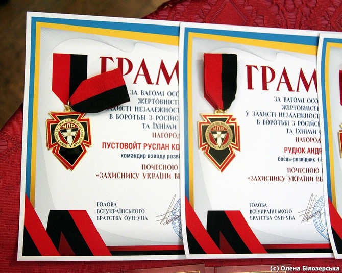 Павук, він же Руслан Пустовойт, починав в УДА, нині у 54-му ОРБ - той самий безбашенний донецький розвідник, який фактично один узяв у полон 8 ворогів, був двічі важко поранений, нині знову в строю. Малий - боєць з мого підрозділу (ОЛПЗ «Вольф» УДА), теж розвідник з величеньким досвідом. Усього нагородили біля 20 бійців, переважно з 54-го ОРБ та з 8-го батальйону УДА. Деяких, на жаль, посмертно...