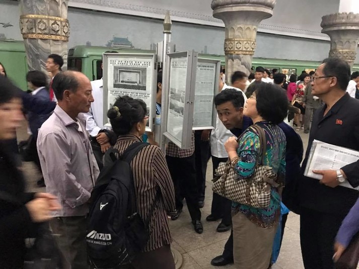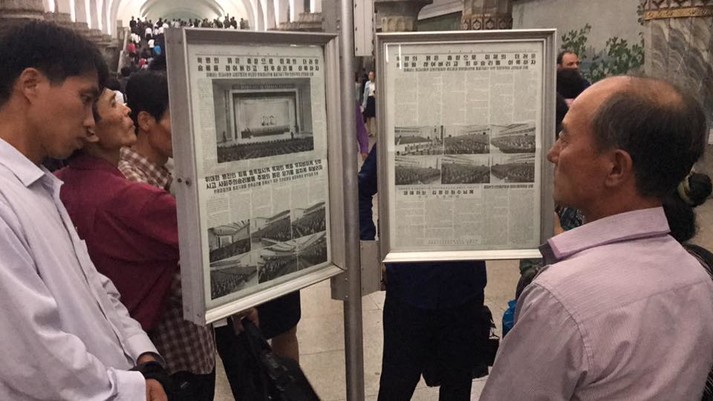 Новости народ узнаёт из газет. Они на стендах на станциях метрополитена. Электронная газета по северо-корейски - сфотографировал стенгазету и позже прочёл с экрана смартфона.