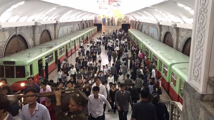 В Пхеньяне есть метро. 26 километров пути, 7 остановок, две ветки. Глубокие помпезные станции в стиле киевских «Золотых Ворот». В вагонах портреты Вождей.