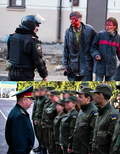 От саме ця політруківська мафія нині керує НГУ. А, тримайте ще вишеньку на тортик. Пам’ятаєте такого полковника Василя Пилипенка? Він ще засвітився на фотках з 18 лютого 2014 року з розгону на Інститутській – на тлі побитих в м’ясо професора КПІ та його сина (ви теж цю фотку можете внизу знайти)? Так ось, після Майдану його відправили керувати Харківською Академією НГУ. Це там, де випускники співали «афіцери, афіцери» на випускному – про це ще Сергій Стерненко знімав відос, пригадую. Так от, його на певний час зняли звідти після скандалу. Але політруківська мафія своїх не кидає. І таваріщ Сподар його швиденько забрав до себе на роботу в Главк. Замполіт замполіта ніколи не кине, угу. І ось тепер ось ці замполіти захопили керівництво в НГУ. Чи то пак – Внутрішніх військах.