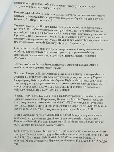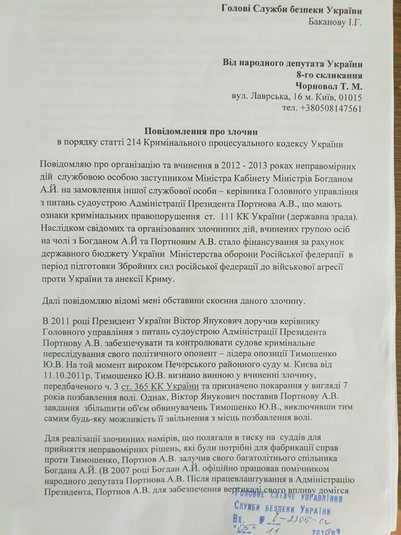 Віднесла Баканову (СБУ) заяву про злочин Андрія Богдана, що має ознаки державної зради (ст.111 КК України). Зрада України полягає в тому, що Андрій Богдан, будучи посадовою особою КМУ в період 2010-2014 років, організував розтрату коштів державного бюджету в розмірі 3 млрд. грн в інтересах Міністерства Оборони РФ. При чому наслідком злочину Богдана стало фінансування з бюджету України Збройних Сил ворога в період його підготовки до нападу на Україну, окупації та анексії Криму (адже 36 млн. грн на рахунки МО РФ було перераховано в 2013 році).