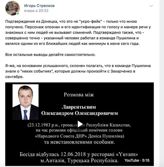 Вчера СБУ выложило материалы прослушки помощника Пушилина по фамилии Лаврентьев, который в Турции (!) договаривался с неизвестными об устранении Захарченко. Дело было в июне 2018, то есть за два месяца до убийства последнего.