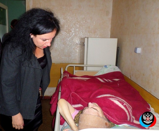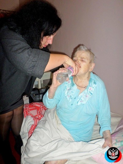 Вот, например, сюжет о визите в горловский хоспис «заместителя мэра» Горловки Виктории Жуковой. Заместитель мэра привезла умирающим нищим пациентам… рисунки. Белочки, зайчики, цветочки. Этот визит освещается на новостных сайтах ДНР, выкладывается целый фоторепортаж. Жукова позирует с полумертвыми одинокими старушками, вешает им на стену кривые акварельные картинки.