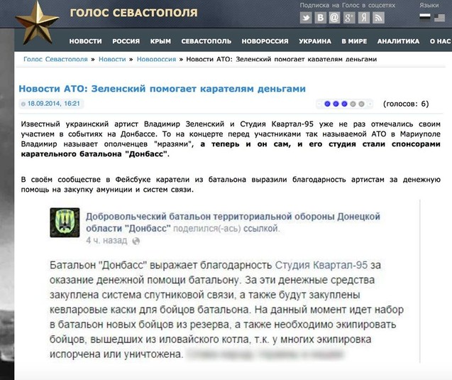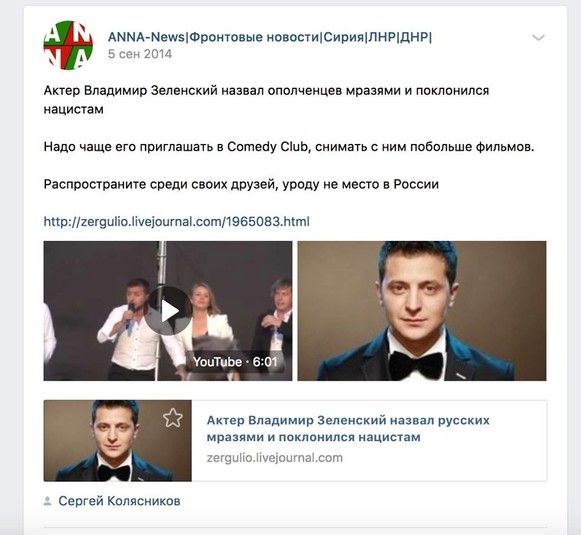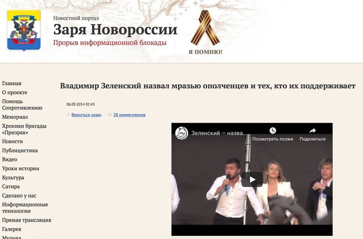 Подобно тому, как у нас иногда цитируют старые номера «95 квартала», где Зеленский говорит какие-то неприятные вещи про Украину, с той стороны тоже возмущенно постят видео, на котором Зеленский кланяется в пояс воинам АТО («карателям!») и называет боевиков ЛДНР «мразью». Выступление Зеленского тогда здорово разошлось по «ватным» пабликам и СМИ и вызвало бурю проклятий. Причем, в отличие от выступлений «Квартала», это не было шуткой.