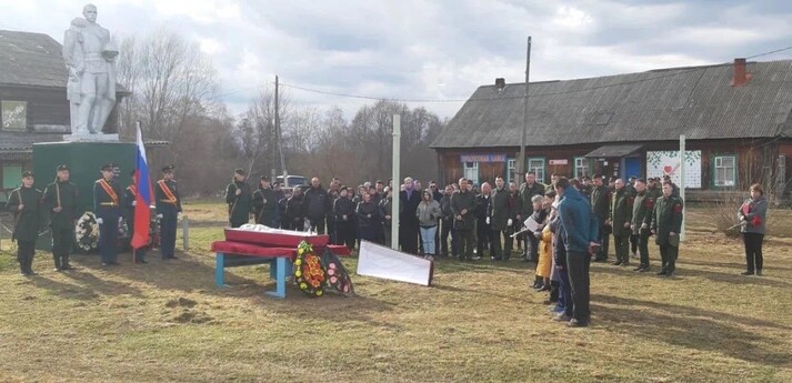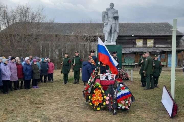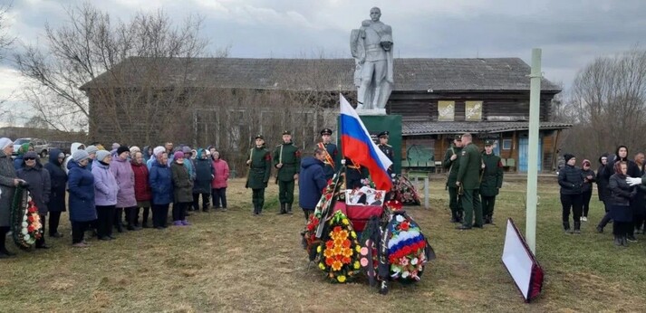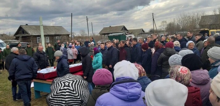 Похороны российского военного в Кировской области РФ. Фотографии позволяют оценить условия проживания «освободителей». На заднем плане видны деревянные избы и гнилые бараки, которые, судя по вывескам, являются почтой или домом культуры.