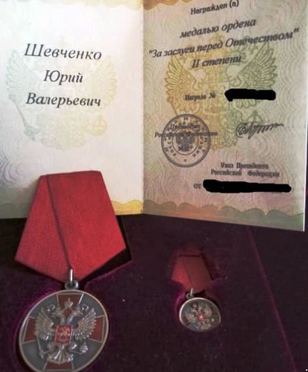 Полевой командир боевиков ЛНР (начштаба так называемой «бригады «Призрак») Юрий Шевченко похвастался российской медалью «За заслуги перед отечеством», которую ему вручили в Кремле.