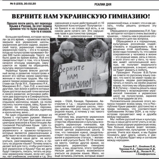 В статье говорится, что российское правительство фактически проводит на полуострове этноцид украинцев. Закрылись все украинские школы и детские садики, украинский театр, украиноязычных газеты. Власти проводят политику полного искоренения любого украинского присутствия.