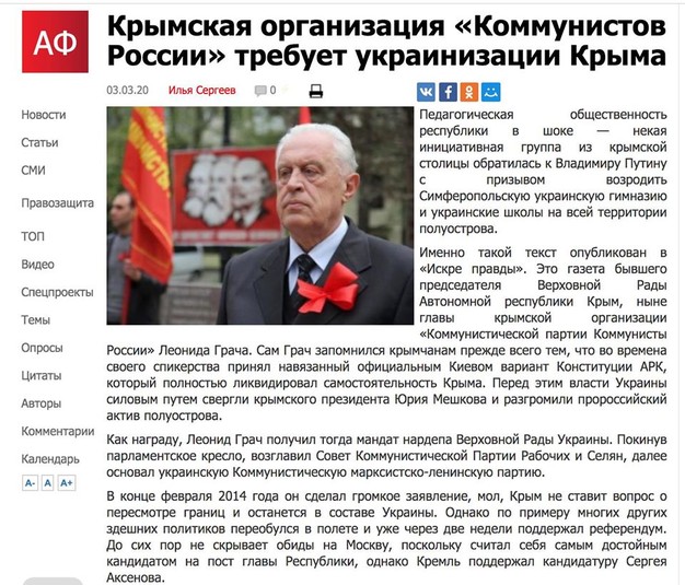 В Крыму произошла какая-то феерическая история. Коммунист Леонид Грач (помните такого?), который теперь возглавляет на полуострове партию «Коммунисты России», внезапно напечатал в партийной газете статью о притеснениях украинцев в Крыму.