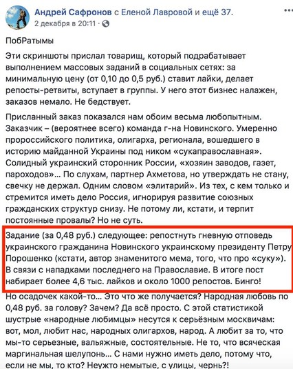 Андрей Сафронов, который живет в Донецке и сочувствует ДНР, рассказывает, как люди Новинского заказали его знакомому накрутить лайков и репостов к посту Новинского на Фейсбуке с гневной отповедью Порошенко.