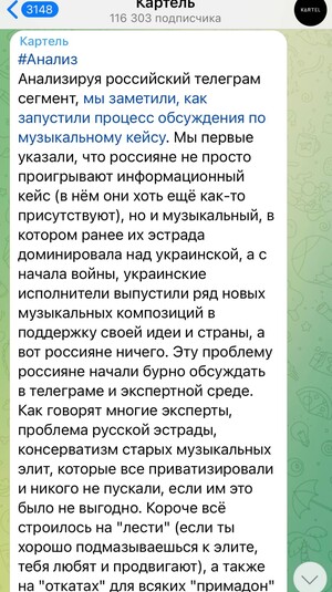 А в РФ так и не вышло никаких значимых песен в поддержку войны (там людоедское истребление украинцев поддерживают разве что откровенные фрики и давно растерявшие популярность старики).