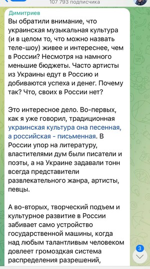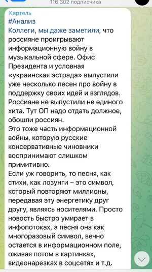 В фашистских русских телеграмм-каналах стоит вой, что Россия проигрывает Украине не только на информационном, но и на культурном фронте. Жалуются, что музыка в Украине живее, талантливее, патриотичнее.