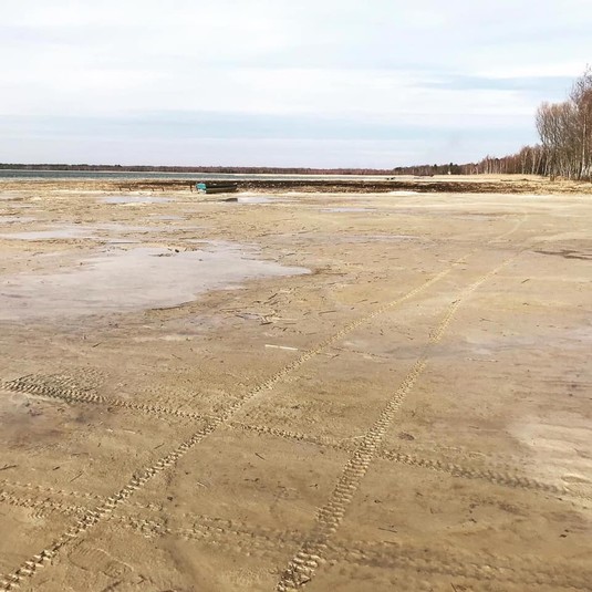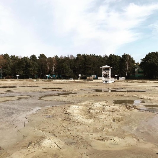 Втім, ситуація серйозніша, ніж здається. Ось так, наприклад, зараз виглядає озеро Світязь на Волині. Рік тому тут була вода. А он там, де на фото парасольки та пірс, був берег. Узбережжя Світязю тепер місцями нагадує колишнє Аральске море, яке зараз майже повністю зникло. Вода відступила метрів на 50.
