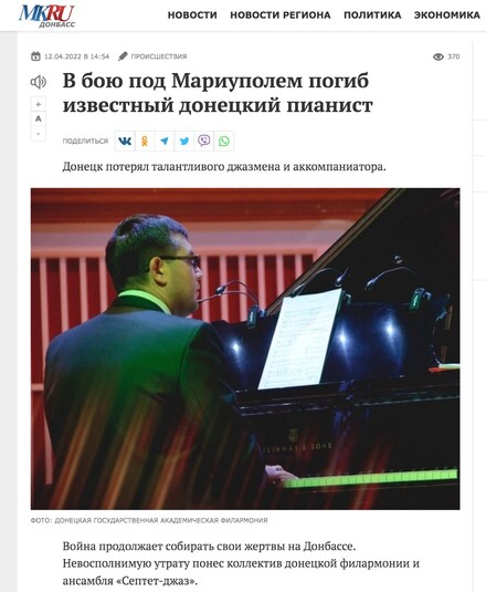 Далее их без всякой подготовки бросили в Мариуполь, где фактически использовали в качестве приманки для выявления огневых точек «Азова». Некоторые музыканты уже погибли. В частности, известный джазовый исполнитель Николай Звягинцев.