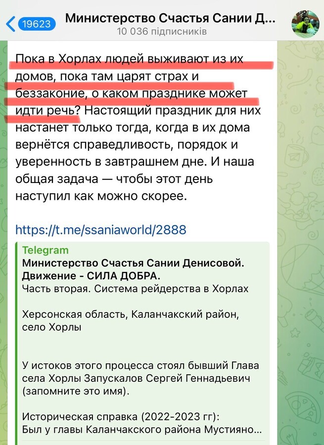 Однак цю брехню спростувала російська Z-волонтерка Санія Денісова, яка відверто написала про те, що насправді відбувалося у Хорлах.