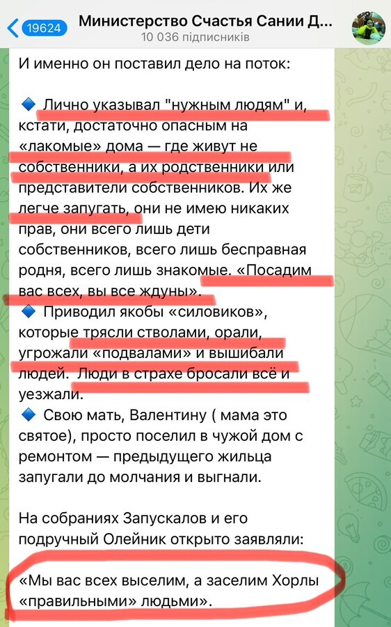 Власників нерухомості та їхніх родичів тероризували та залякували, погрожували оголосити прихильниками України та кинути на підвал, якщо вони не поїдуть. Так із села вигнали корінне населення, а замість нього заселяли Хорли «правильними людьми» - тобто росіянами.