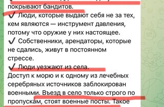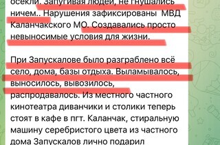Денисова детально описує, як поставлений окупантами головою села Сергій Запускалов, відбирав у корінних мешканців села будинки та землю, оголошуючи їх «бесхозом» (та сама схема, що й у Маріуполі).