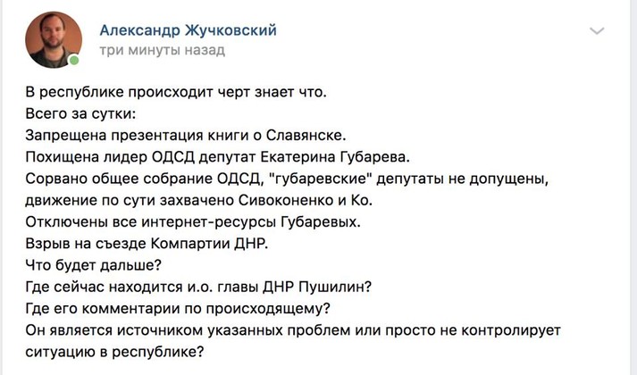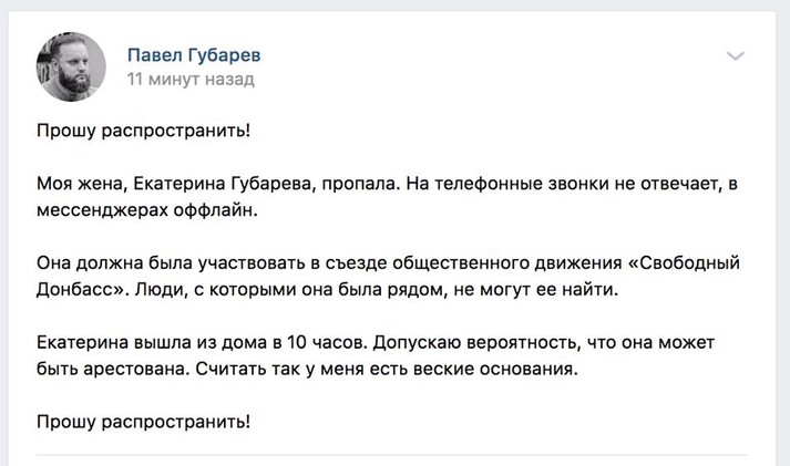 Жену Павла Губарева похитили, она не отвечает на звонки, скорее всего арестована. Партия «Свободный Донбасс», которую возглавляло семейство Губаревых, рейдерски захвачена группировкой людей Пушилина. Сегодня прошел съезд этой организации, на который людей Губаревых не допустили. Захвачены также подконтрольные Губаревым СМИ.