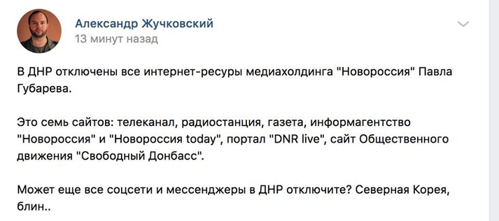 Особенно смешно читать сейчас возмущенные посты сторонников Губарева. Жучковский сокрушается, что устроили Северную Корею в Донецке. А чего сокрушаться? Ведь ровно этого с самого начала и хотели. Когда четыре года убивали и пытали людей в подвалах, в том и числе и своих соратников, дурачков, которые поверили в Новороссию - это что было? Когда избивали дубьем, резали ножами в мирном городе сторонников Украины, это что было? Разве не Северная Корея?