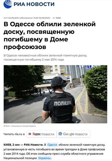 Государственные российские СМИ подают эту новость так, как будто мемориальная доска была установлена в честь пророссийского активиста, погибшего в Доме профсоюзов.