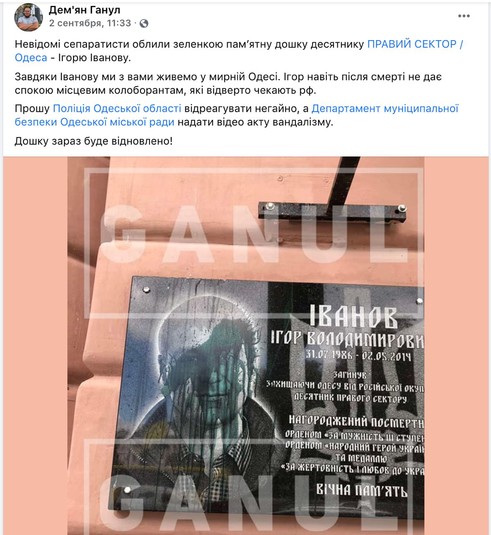 Недавно в Одессе облили зеленкой мемориальную доску десятнику Правого сектора, стороннику Украины Игорю Иванову, который погиб во время событий 2 мая 2014 от рук «мирных пророссийских активистов».
