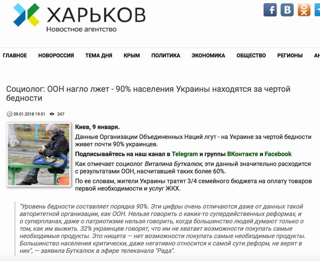 Периодически встречаю на сайтах антиукраинской направленности комментарии некой Виталины Буткалюк. Пишут, что это украинский социолог. Примерно раз в полгода Буткалюк заявляет, что в Украине за чертой бедности живет 90% населения. Понятное дело, на эти слова тут же начинают ссылаться все, кому нужно изобразить картину тотального апокалипсиса в Украине, и цифра начинает гулять по российским СМИ.