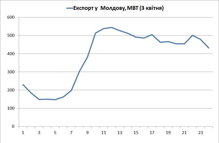На першому графіку обсяги електроенергії, які пішли з України до Молдови протягом доби 3 квітня. Такі потужності коливалися від 150 МВТ (вночі) до 520 МВТ (о 12 годині дня). Дивний графік, як для Енергоатому, який працює рівним графіком і не може так маневрувати, правда ж?