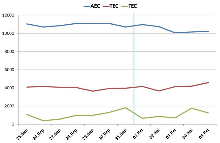А давайте тоді подивимося другий малюнок, де графік виробітку трьох найбільших видів генерації України (теплова, атомна і гідро) з 25 березня по 5 квітня. І дивина - з початком експорту до Молдови виробіток Енергоатому не виріс, а навпаки знизився. А виробіток маневрених потужностей, зокрема теплової генерації навіть трохи виріс, хоча мав би знизитись, бо закінчився опалювальний період і вдень значне потепління.