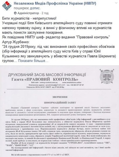 - У заяві НМПУ я побачив маніпуляцію, адже побитий нібито журналіст співпрацює і з «Шарій.нет». Принаймні так стверджують громадські активісти. Допустимо, це правда. Але НМПУ наголошує на тому, що це журналіст газети... «Правовий контроль». Ну ок, у людини може бути ксіва. і формально все правильно. За часів мого членства в організації ми не ділили журналістів на наших членів і ні. але критеріям свого позиціонування визначали те, чи приймемо ми до своїх лав такого журналіста. Так от.