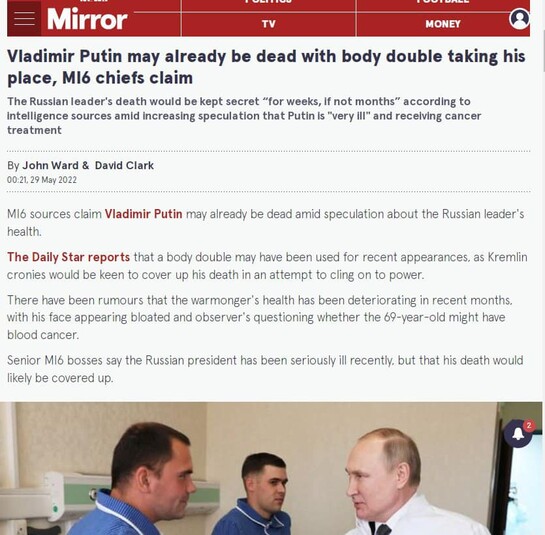 Так, це рівень чуток – але коли чутки офіційно поширюють як припущення старші керівники МІ-6, це таки щось значить. Можливо, це створення неофіційного приводу для відмови контактувати – «ми не певні, з ким саме нам пропонують контактувати – чи з Путіним, чи з двійником». Можливо, це створення приводу для відмови в переговорах, коли ЗСУ після отримання потужної зброї для контрнаступу посуне окупантів на початкові позиції і Кремль шукатиме домовленостей.
