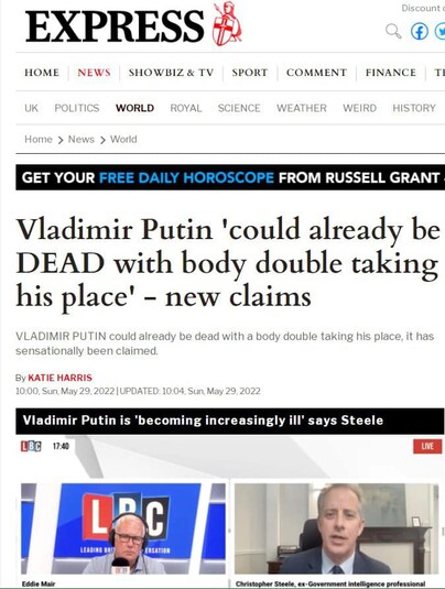 Кілька днів тому у Великій Британії почали поширювати матеріали про ймовірну смерть Путіна (можливо, від раку крові) – що в такому випадку його оточення все би приховало, щоб не втратити владу. Саме тому є шанс, що на всі останні публічні виходи Путіна випускали двійника.