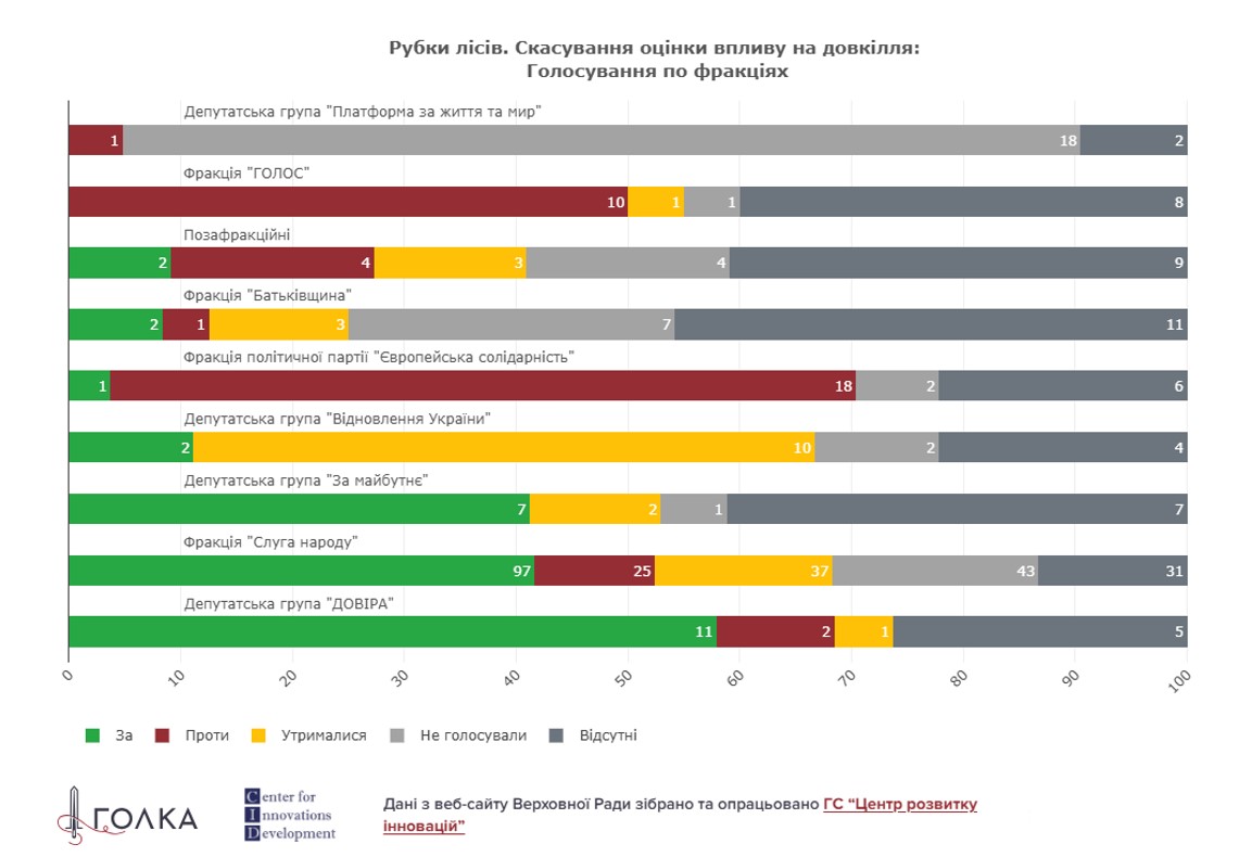 Народна депутатка Юлія Овчинникова («Слуга народу»), яка входить до екологічного комітету, наголошує на тому, що парламент чітко висловився, коли йому пропонували у 2024 підтримати скасування оцінки впливу на довкілля: «Цей законопроєкт відхилили в першому читанні. Тепер цряд вирішив підмінити собою Верховну Раду і провести постанову, яка скасовує оцінку впливу на довкілля на суцільні санітарні рубки. Це не тільки прямо суперечить нашому законодавству - бо лише закон визначає, яка діяльність проходить оцінку впливу на довкілля, а яка – ні. Але й це просто протилежне тому, про що просять наші європейські колеги! Ця постанова – це загроза не лише для Карпат, а й для репутації України на міжнародній арені».
