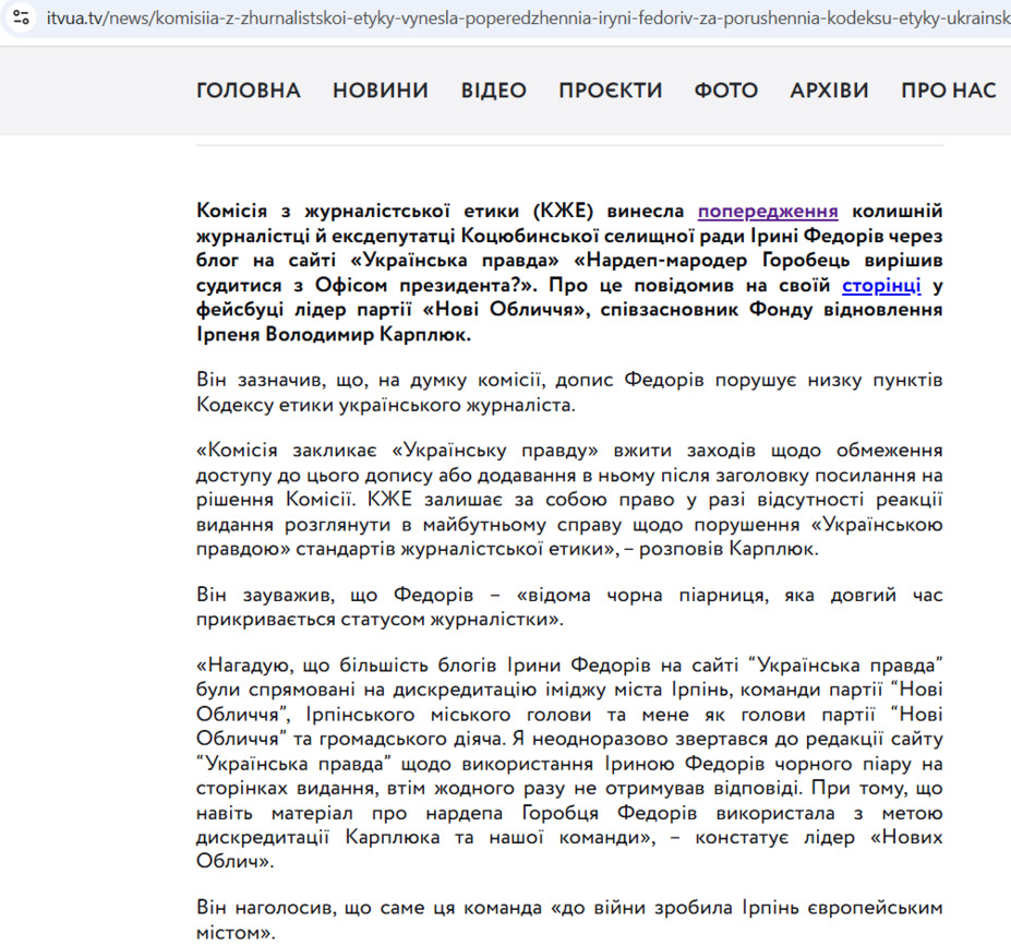 Такий висновок Комісії журналістської етики став інструментом для спроби зруйнувати мою репутацію. Ось, що писали у медіа, які підконтрольні ексмеру Ірпеня Володимиру Карплюку.