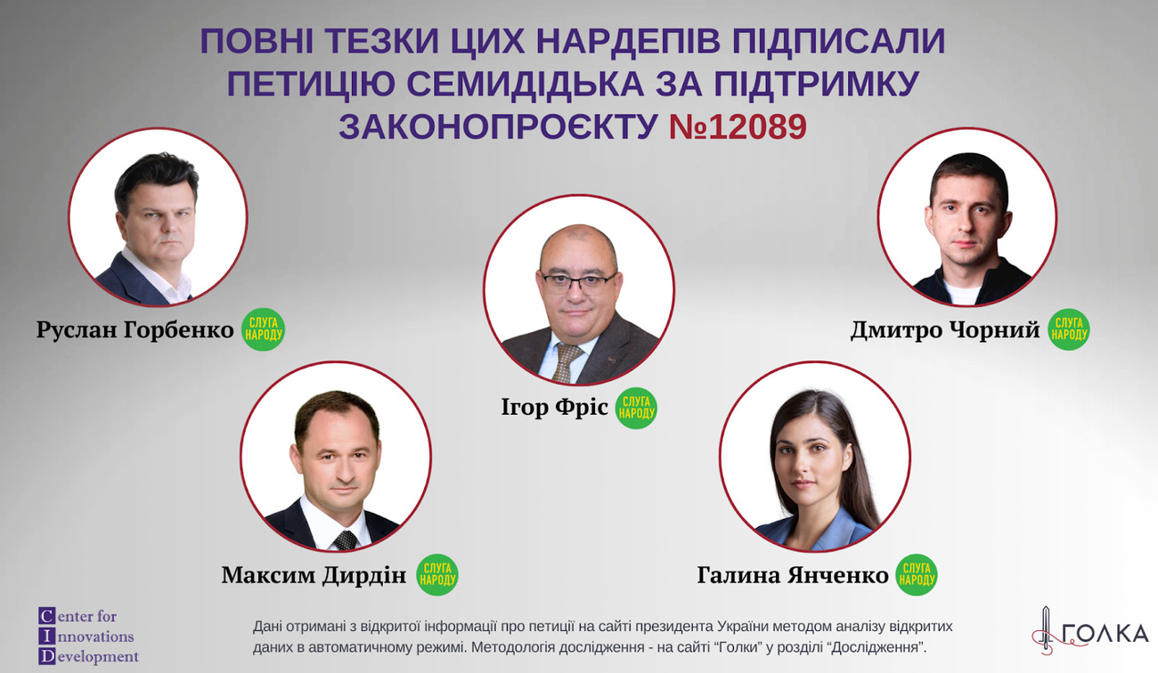 А петицію в інтересах недоброчесного бізнесу з вимогою до президента підписати закон, своїми підписами підтримав нардеп та ключовий автор проєкту Ігор Фріс («Слуга народу») та повні тезки його чотирьох колег по фракції Галина Янченко, Руслан Горбенко, Дмитро Чорний та Максим Дирдін. Усі вони голосували за 12089.