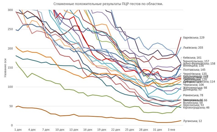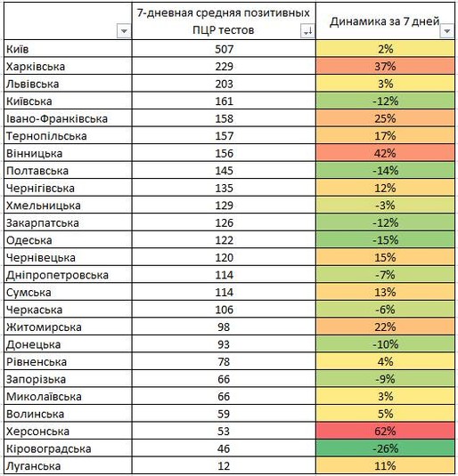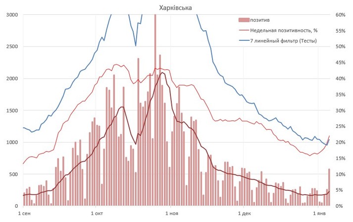 Особенно как-то не очень выглядит Харьковская область. Вчера провели 1807 тестов, из них 575 были положительные. Позитивность 31,8%, недельная 22%