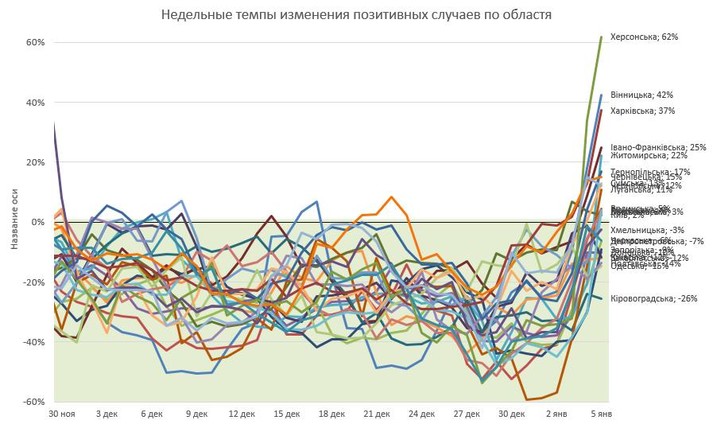 Конечно в некоторых областях таких как Херсонская рост на 62% выглядит пугающе, но это все происходит на малых цифрах. До этого было в день 20-30, стало 53, вроде и рост большой, но цифры маленькие.