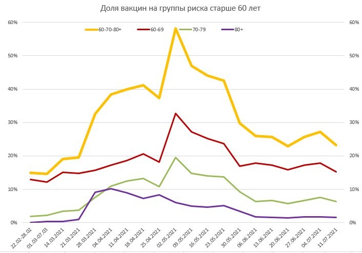 За прошедшую неделю всего 23% первых доз было сделано людям 60+лет. В то время как в мае их доля доходила до 60%.