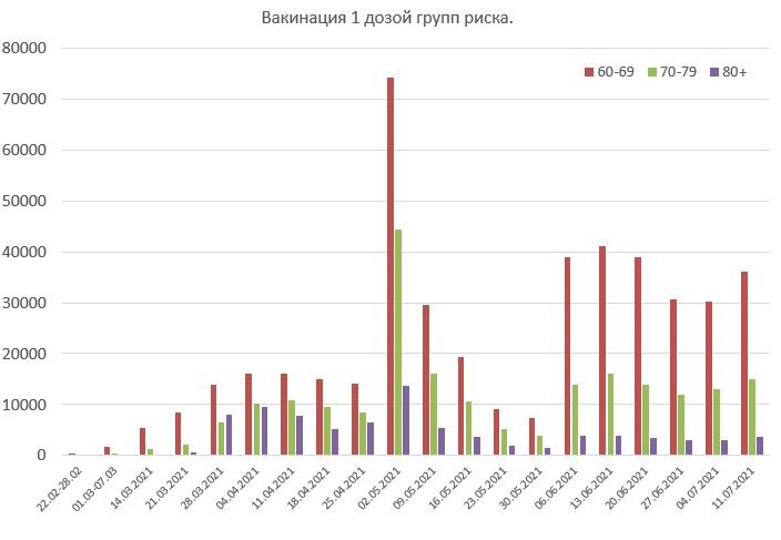 Вот чистый график по вакцинации первой дозой. Роста среди старших возрастных групп НЕТ !!!! Вакцинация ужасно малыми темпами происходит.